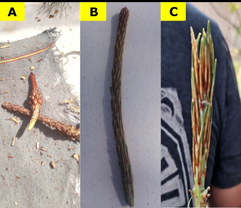 El 29 de abril de 2023 se recolectaron brotes del último ciclo de crecimiento de 12 árboles superiores, con base en su crecimiento y conformación, ubicados en Chignahuapan e Ixtacamaxtitlán, Puebla. Los árboles seleccionados tenían altura (18 a 26 m) y diámetro (19 a 25 cm) dominante, fuste recto, inserción de ramas en ángulo cercano a 90° y buena poda natural. En cada procedencia se seleccionaron seis árboles: dos con yemas en latencia, dos en el inicio del crecimiento de las yemas y dos con yemas en pleno crecimiento. Los estadios fenológicos se definieron con base en las características de crecimiento de las yemas; las púas en latencia fueron aquellas en las que no se observó elongación de las yemas (Figura 1A), mientras que las púas en crecimiento mostraron elongación inicial (inicio del crecimiento) (Figura 1B) y desarrollo de las mismas (pleno crecimiento) (Figura 1C).