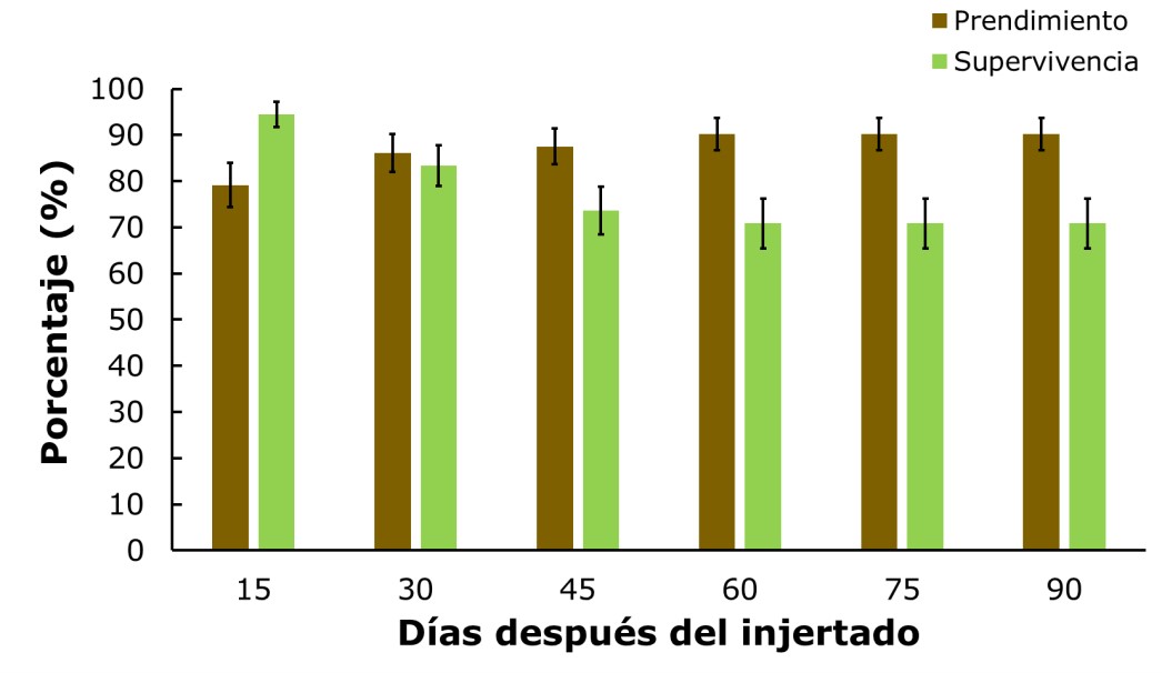 Se observó un alto prendimiento desde los 15 días después del injertado (79.2 %) hasta aumentar a 90.3 % a los 60 días, para después mantenerse estable. Como es de esperarse al realizar injertos, se identificó una disminución de la supervivencia en cada evaluación, la cual varió de 94.4 a 70.8 % desde la evaluación inicial hasta la final. El que existiera mayor prendimiento que supervivencia se explica por el hecho de que no todos los injertos que muestran señales de “compatibilidad” pueden sobrevivir en el transcurso del tiempo, ya sea por la unión deficiente del cambium vascular, la muerte de la planta patrón o de la púa por estrés, ataque de plagas o nutrición deficiente (Barrera-Ramírez et al., 2021). Al respecto, no se detectaron causas aparentes de mortalidad, por lo que se presume que la muerte de los injertos prendidos pudo deberse a incompatibilidad temprana.