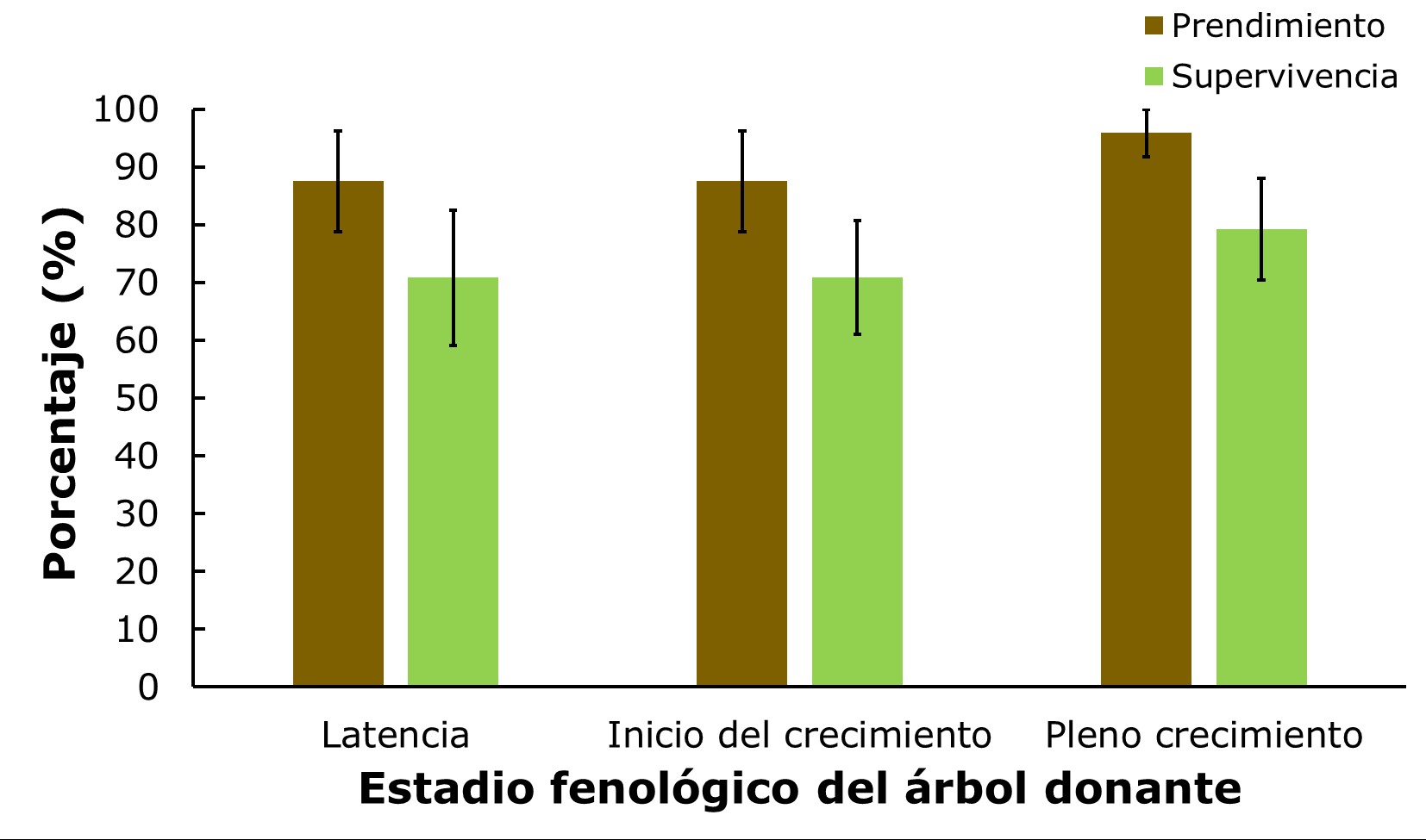 No se detectaron diferencias estadísticas (p<0.05) en el prendimiento y supervivencia por efecto del estadio fenológico de los árboles donantes a los 90 días posteriores al injertado (Figura 4), ello a pesar de que existió una diferencia de 11.3 % en el prendimiento (98.8 vs. 87.5) y 8.3 % en la supervivencia (79.1 vs. 70.8) entre los valores extremos.