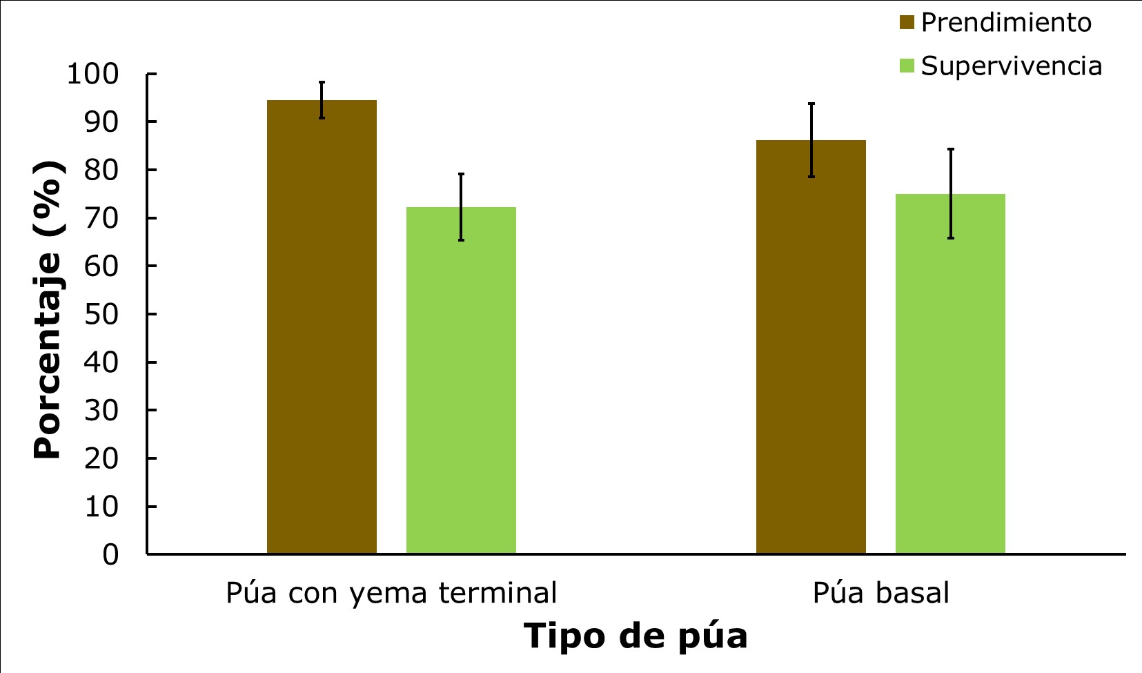 Se esperaría que en injertos con yemas terminales exista más prendimiento dada la mayor función fotosintética y producción de carbohidratos que este tipo de púas presentan (González-Jiménez et al., 2023), situación que se observó a pesar de no ser estadísticamente distinto al uso de varetas basales. No obstante, ese aspecto también podría afectar la supervivencia debido a la mayor cantidad de recursos (agua y nutrientes) que requieren para su correcta funcionalidad, por lo que son vulnerables a factores externos como plagas, enfermedades y estrés hídrico (Marmolejo et al., 2020). Al respecto, el uso de púas basales es eficiente para efectuar injertos de P. patula debido a la buena capacidad de rebrote de la especie (Aparicio-Rentería et al., 2014).