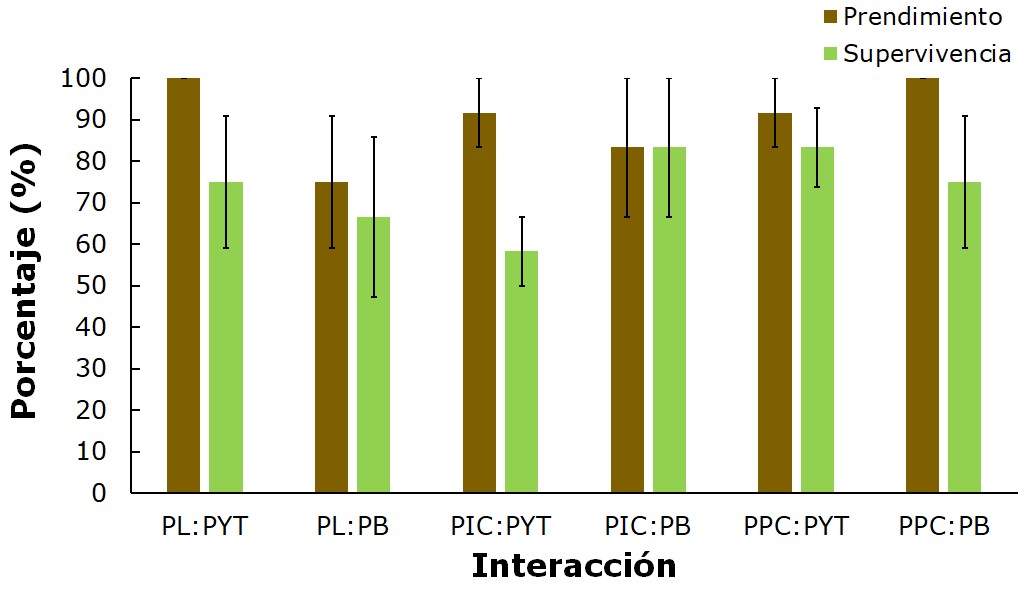 Las interacciones no mostraron un efecto significativo (p=0.05) en relación al prendimiento y la supervivencia a 90 días del injertado (Figura 6).