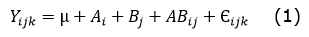 Yijk = Valor de la variable respuesta de la k-ésima repetición del i-ésimo nivel de A y del j-ésimo nivel de B