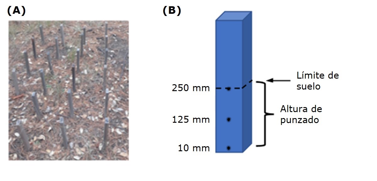 A = Colocación de las probetas (bajo suelo); B = Distribución de las incisiones en las probetas de 500 mm.