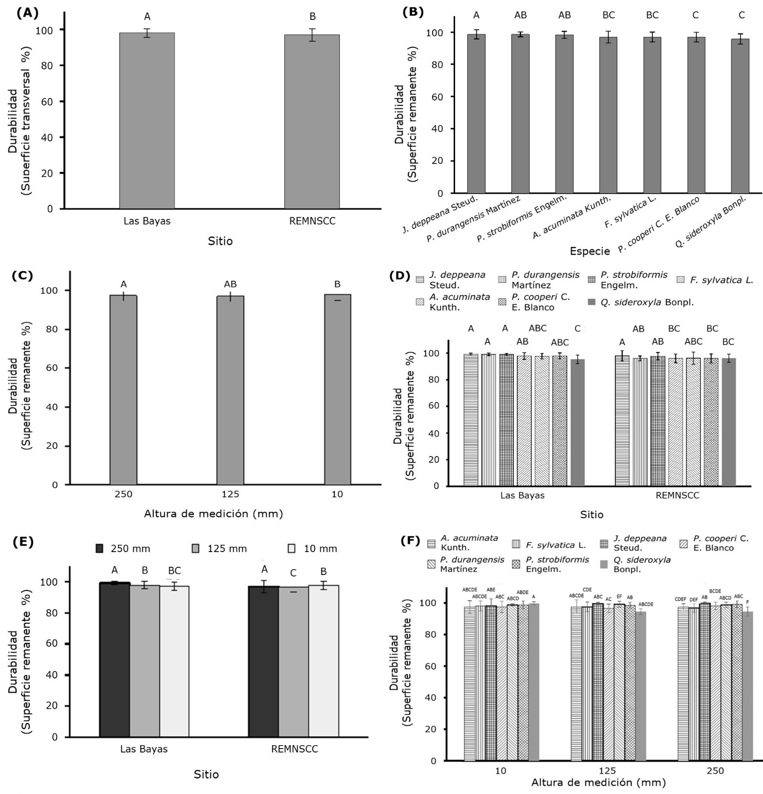 En la localidad Las Bayas, la durabilidad natural promedio de las seis especies se clasificó como Clase 1; en el sitio REMNSCC se deterioraron más las maderas, por lo que se ubicaron en la Clase 3 (Figura 3A).