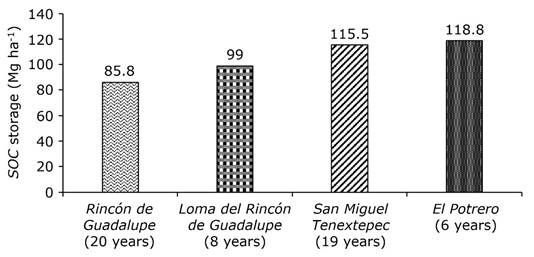 The C storage represented by soil is important in climate change mitigation. Soil has the capacity to store more C than aboveground biomass, but for C accumulation in the soil to occur, there must be a constant supply of plant material (Ontl and Schulte, 2012). The SOC stores of the soils are shown in Figure 2. The soil of the El Potrero plantation stored 38.5 % more C than Rincón de Guadalupe, 15.4 % more than in Loma del Rincón de Guadalupe and 3 % more than San Miguel Tenextepec. The lower amount of C stored in the Rincón de Guadalupe and Loma del Rincón de Guadalupe plantations is due to their previous initial agricultural vocation. In the El Potrero plantation, although the plot was intended for agriculture, in the management of the plantation contributions of organic fertilizers (manure) were made, which explains the greater carbon storage. Finally, in San Miguel Tenextepec, the land preserved its forest vocation, thereby maintaining a high level of C in the soil.