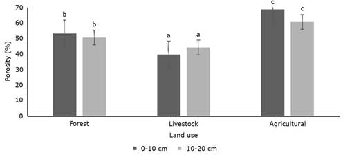 The results of the physical and hydrological variables of livestock use with respect to those obtained in the forest can be attributed to the effect of trampling by livestock, which has already been recorded in several studies at a global level, in which it is described that the compaction of the soil can affect the first 20 cm of its depth (Karlin et al., 2019), which agrees with the depths analyzed in the present study. Gómez et al. (2014) mention that in these areas, livestock extensively take advantage of the plant cover made up, to a large extent, of grasses, which causes the soil structure to weaken; this considerably reduces the proportion of soil pores due to animal load and, therefore, the levels of water entry into the profile decrease significantly.