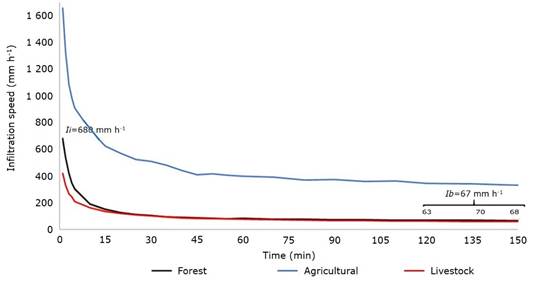 Variable Ii was 680 mm h-1 in the forest area, with an increase of 145 % in the agricultural area and a decrease of 40 % in livestock use. The Ib was similar between the forest area and livestock use, however, it increased by 500 % in the agricultural area. While the Ia presented the following order of descending: agricultural>forest>livestock (Table 5).