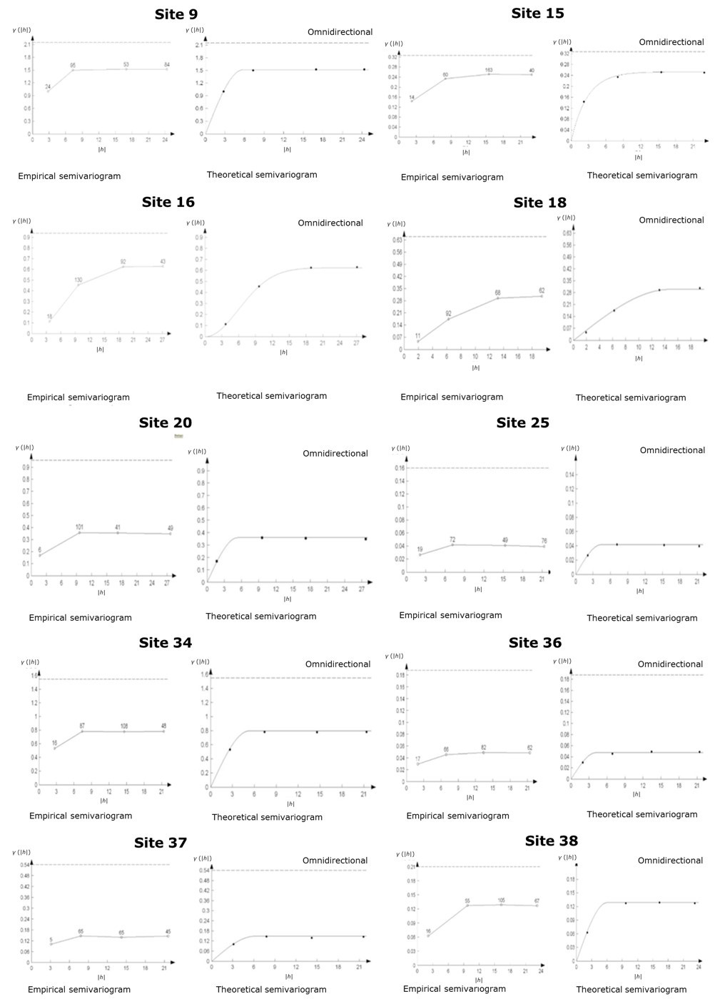 Most of the theoretical semivariograms (8 out of 10) were fitted to spherical “aggregate spatial arrangement” models. Site 15 was fitted to an exponential model (continuous spatial phenomena), while Site 16 was fitted to a Gaussian model (smooth phenomena, i. e., continuous at all points) (Figure 2).