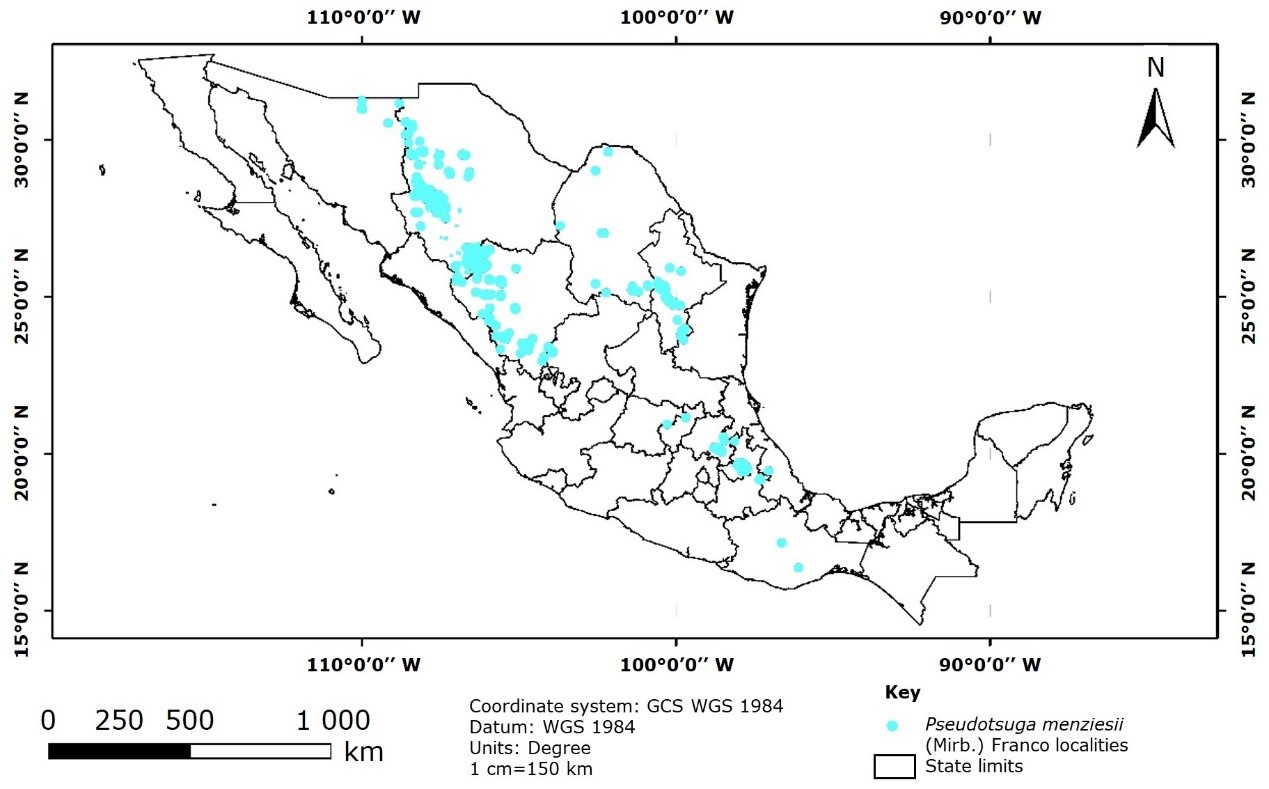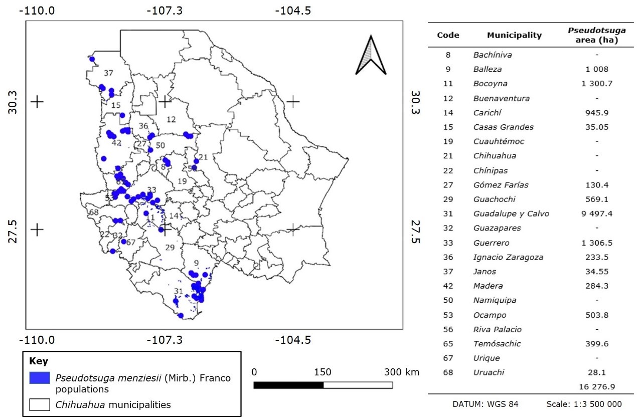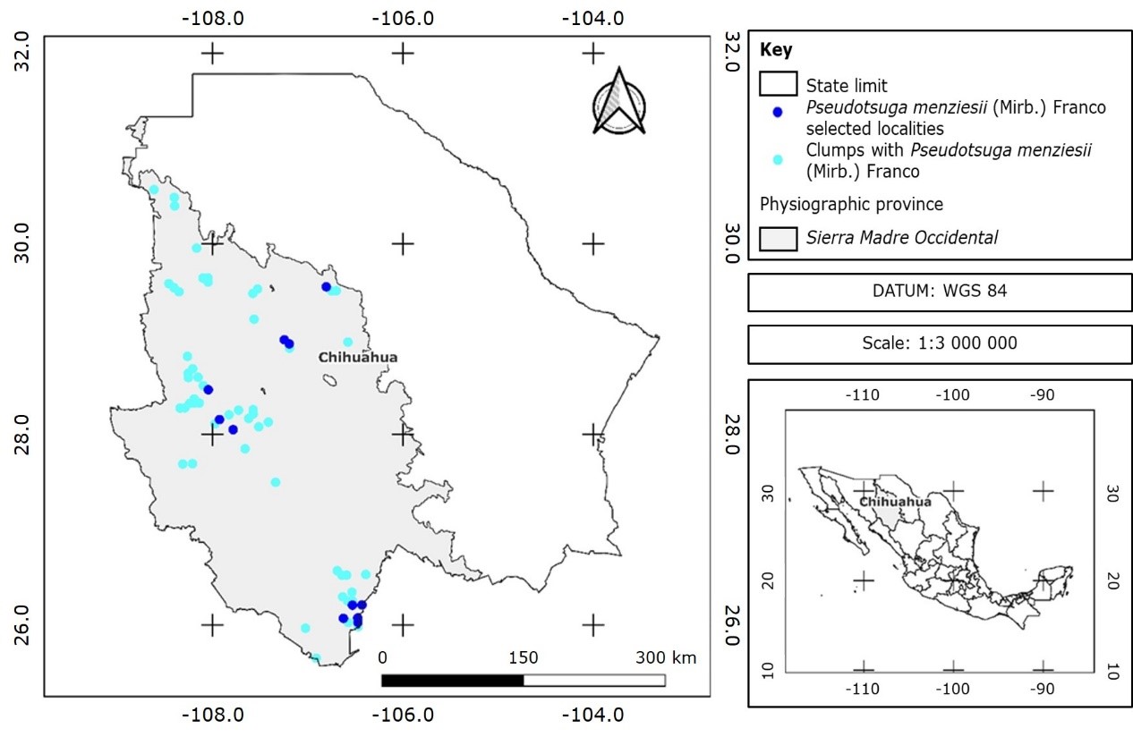 The state of Chihuahua is the largest in the Mexican Republic, it has a great diversity of species and ecosystems, and one of the most representative associations is its temperate forests, with an area of 7.4 million hectares (Inegi, 2021). They are distributed in the Northern part of the Sierra Madre Occidental (SMO), which has been recognized as a megacenter of diversity (Felger et al., 1997). Numerous endemic species survive in these ecosystems, or within the NOM-059-SEMARNAT-2010 (Royo-Márquez et al., 2014), such as Pseudotsuga menziesii (Mirb.) Franco, a species “subject to special protection” that lives in small discontinuous populations in the high parts of the mountains (Rzedowski, 2006; Mápula-Larreta et al., 2007).