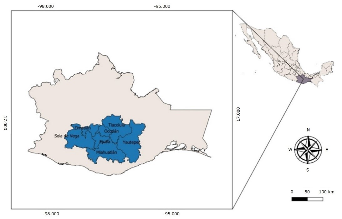 The scope of the study was the "mezcal region", which is located in the South-central part of the state of Oaxaca, geographically located between -96° and -98° W, and 16° and 17° N (Figure 1), at 800 to 1 700 masl, with an average temperature between 20 and 25 °C, and an annual precipitation ranging between 508 and 644 mm; the predominant climates are Bs, Bs0 and (A)c (Bravo et al., 2007; Amoroz, 2011).