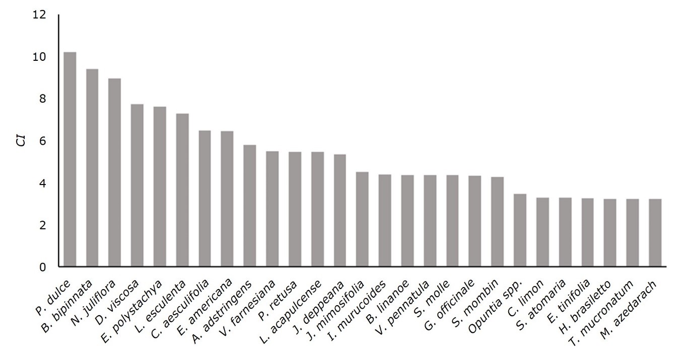 Amphipterygium adstringens (cuachalalate) stood out for having the highest value of CI=9.41, resulting from the sum of Iu=25 % obtained as the percentage of eight types of uses out of a total of 16, plus 12 % corresponding to the frequency of mentions, plus a value of eight corresponding to the number of uses (Table 3). Leucaena esculenta (leadtree) exhibited a CI=7.3, followed by Bursera bipinnata (copal) with a CI=5.8, and finally by Bursera linanoe (linaloe), with a CI of 4.37.