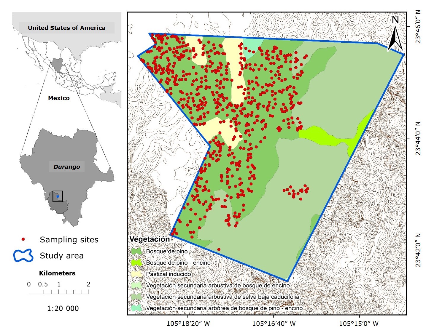 The study area included the Adolfo Ruiz Cortines ejido, located in Pueblo Nuevo municipality, in the Southwestern region of the state of Durango, within the Western Sierra Madre (Figure 1). The climates present are temperate sub-humid C(w2) and semi-warm sub-humid (A)C(w2), with an average annual precipitation of 1 000 mm. The altitude above the sea level varies between 2 063 and 2 670 m (Rosales, 2016). The main vegetation types are mixed forests composed of the genera Pinus L. and Quercus L., the most representative vegetation types being pine forest (P), pine-oak forest (Pq) and oak-pine forest (Qp) (Rosales, 2016).