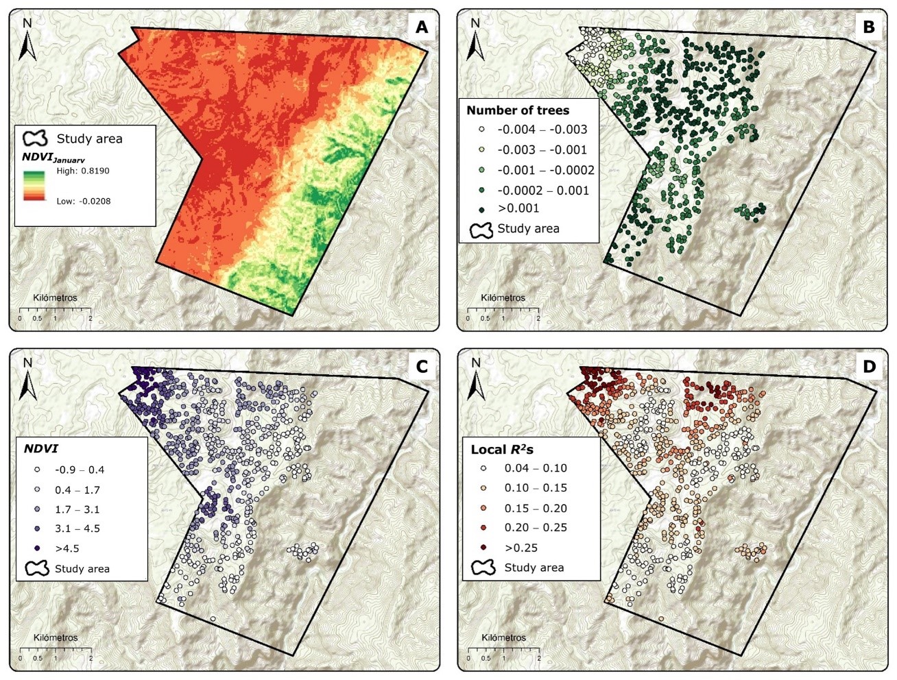 A = NDVIJanuary; B = Regression coefficient associated with a number of trees; C = Regression coefficients associated with NDVIJanuary; D = Local R2s. Kilómetros = Kilometers.
