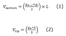 The volume per section (Vsection, m3) was calculated using the Smalian formula (Equation 1) and the tip volume (Vtip, m3), with the cone expression (Equation 2) (Niño et al., 2018). These two volumes (Vsection and Vtip) were added to obtain the stem volume of the tree (Sv, m3).