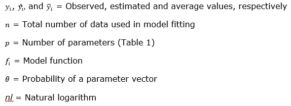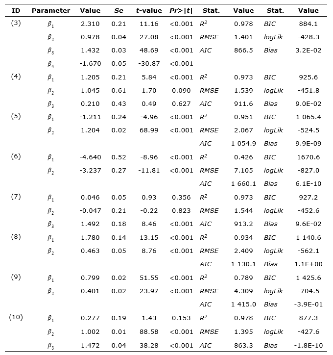 Generally, statistic fit is performed by Ordinary least squares (OLS) (Rachid et al., 2014), seemingly uncorrelated equations (SUEs) (Flores et al., 2021), maximum likelihood (MLL) (Hernández-Ramos et al., 2017), nonlinear generalized least squares (NLGLS) (Monárrez-González et al., 2024), and Marquardt sum of squares minimization algorithm (Niño et al., 2018). However, mixed-effects models (MEM) (Tamarit et al., 2014) or the inclusion of Dummy variables can statistically improve the results (Torres et al., 2020).