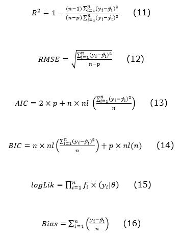 The selection of the model was based on the significance of the parameter (a=0.05), the coefficient of determination (R2, Equation 11), the root mean square error (RMSE, Equation 12), the Akaike (AIC, Equation 13) and Bayesian (BIC, Equation 14) information criterion, and the natural logarithm of the likelihood function (, Equation 15) and Bias (Equation 16) (Bronisz & Mehtätalo, 2020; Hernández et al., 2013).