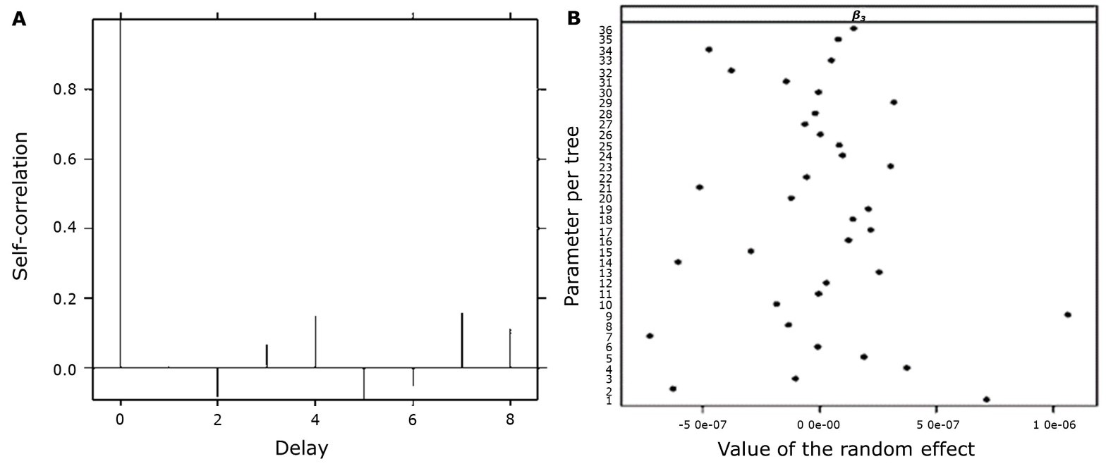 A = Autocorrelation of the residuals; B = Distribution of the random values of the parameters tree by tree.