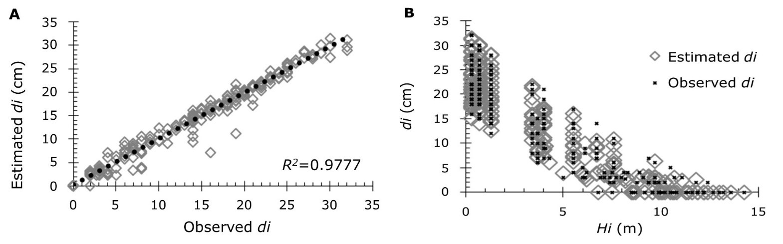By deriving the compatible trade volume model to fit it, authors like Niño et al. (2018) simultaneously achieve satisfactory results, since they obtain accurate expressions of Vs and Vc, in addition to modeling the taper. This strategy is also applied by Cruz-Cobos et al. (2008), Hernández-Ramos et al. (2018), and Torres et al. (2020) to model the di with different fitting techniques and approaches, thereby generating, in all cases, an expression of Vs applicable to the sample of trees analyzed for specific taxa and regions.
