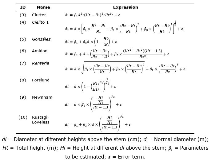 Based on 245 pairs of di and Hi data, eight tapering expressions were fitted (Pompa et al., 2009; Ramírez-Martínez et al., 2018; Torres et al., 2020) using the Rstudio® 2024.04.2 version Build 764 software, in a first approach through nonlinear least squares (NLS) with the nls function (Table 1) (Baty et al., 2015; R Core Team, 2024). To avoid statistical convergence issues in the fits, a value of delta=0.01 and a tH value equal to zero were included in the di to prevent loss of observations (Hernández et al., 2013).