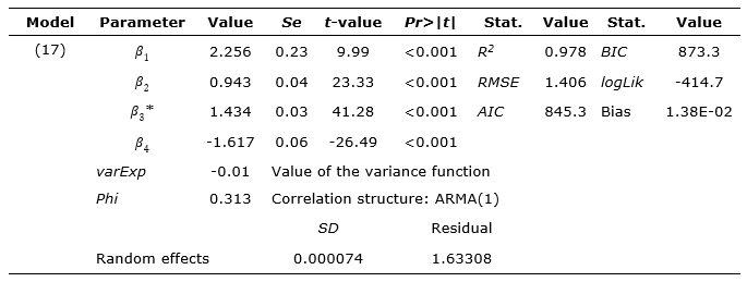Se = Standard error; R2 = Coefficient of determination; RMSE = Root mean square error; AIC and BIC = Akaike and Bayesian information criterion, respectively; logLik = Log likelihood logarithm; SD = Standard deviation; ARMA = Autocorrelation moving average correlation structure; * = Parameter including the random effect; varExp = Value of the variance function; Phi = Correlation structure: ARMA(1).