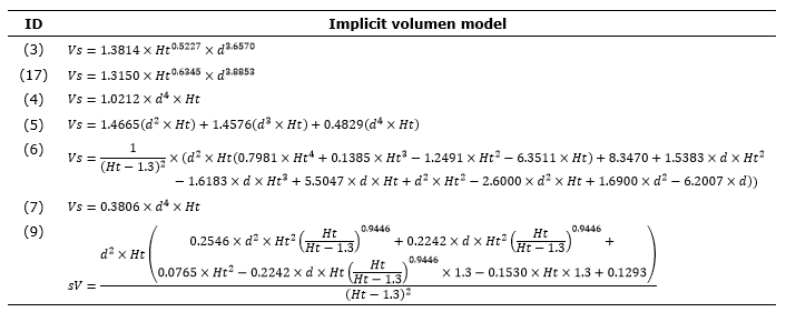 In order to identify the implicit Vs models for each di expression, mathematical forms were developed to estimate the Schumacher-Hall type Vs for Clutter's, Cielito 1, and Rentería models; González, Amidon, and Newnham include in their structure the form of combined variable , but, overall, the implicit mathematical expression is hardly applicable; the Forslund and Rustagi-Loveless models do not have an explicit mathematical solution, so they are not included in Table 5.