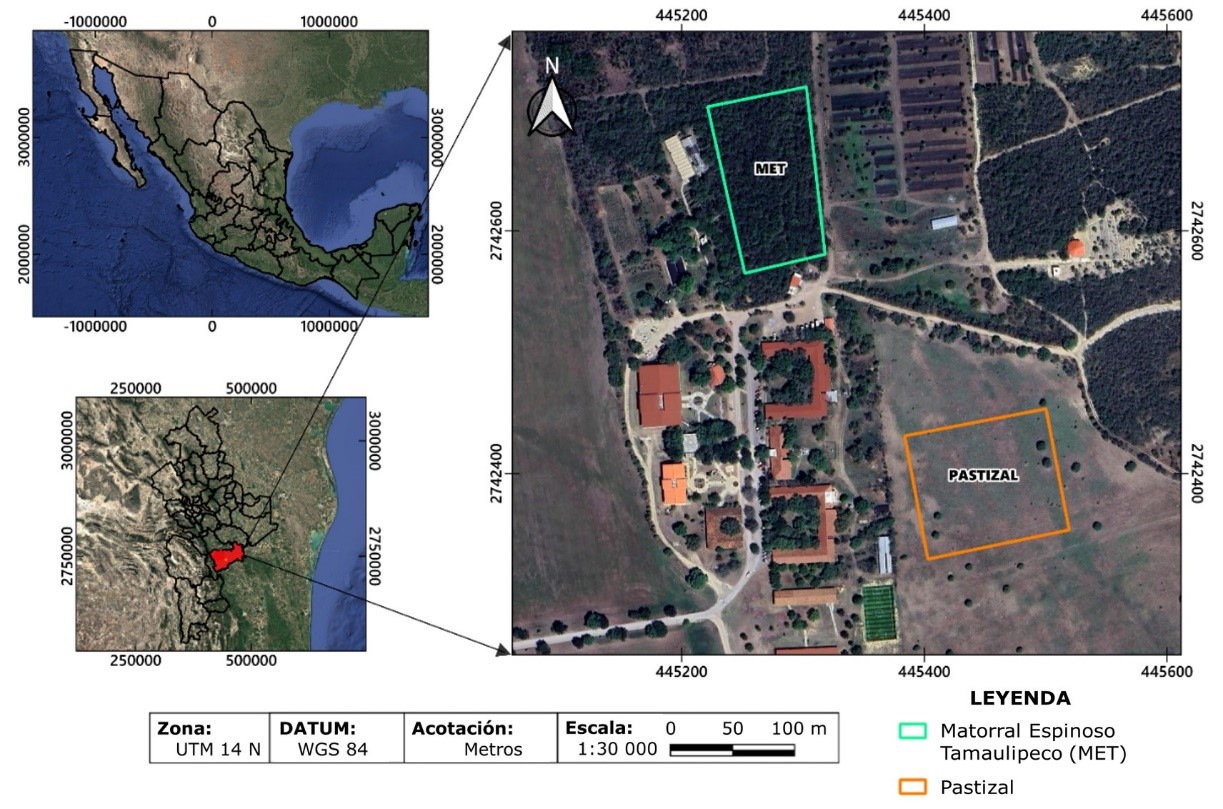El estudio se realizó en el municipio Linares, Nuevo León, en el campus de la Facultad de Ciencias Forestales de la Universidad Autónoma de Nuevo León, a una altitud de 380 m, temperatura media mensual de 22.4 °C y precipitación media anual de 805 mm. La vegetación característica corresponde al Matorral Espinoso Tamaulipeco y un área de pastizal de la especie Dichanthium annulatum (Forssk.) Stapf (Yáñez et al., 2018) (Figura 1).
