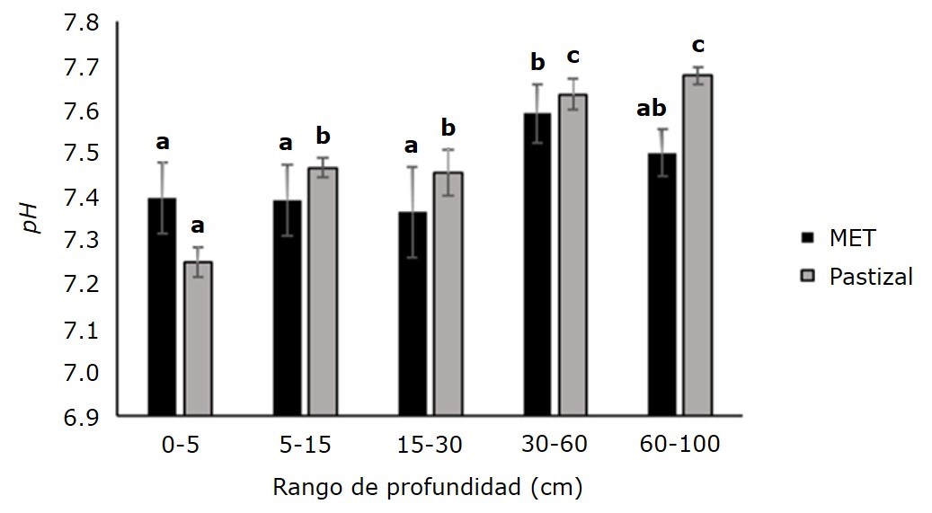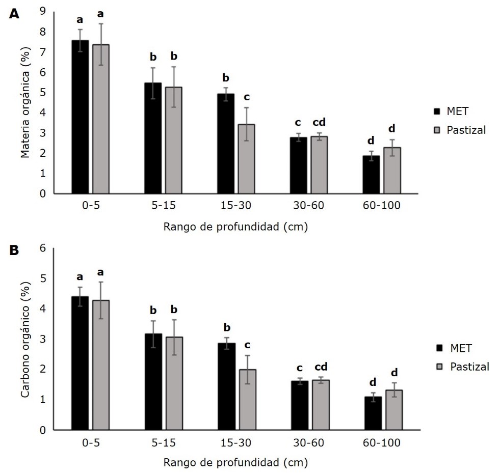 Los contenidos más altos de Carbono orgánico en ambos usos de suelo (4.39 y 4.27 % para el MET y Pastizal, respectivamente) se registraron en la profundidad de 0-5 cm, debido a que en esta profundidad se verifica la mayor acumulación de materia orgánica y, por ende, se presenta la mineralización más alta (Cantú & Luna, 2022).