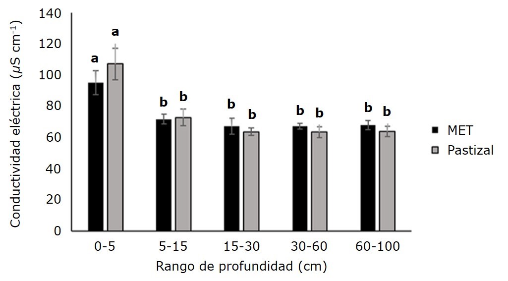 Cuadro 2. ANOVA de dos vías para usos de suelo (MET y Pastizal), profundidades (0-5, 5-15, 15-30, 30-60 y 60-100 cm) y su interacción en las propiedades químicas de un Vertisol.