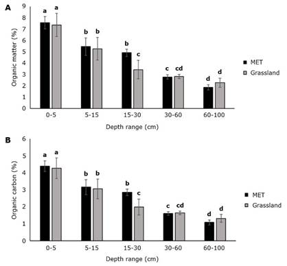 Figure 2 illustrates the variables by depth range, where it is evident that organic matter (SOM) and Organic Carbon (%C) showed a uniform downward trend with increasing depth in both land uses. In the MET, in particular, the highest levels of SOM and %C were recorded at depths of 0-5 cm, reaching values of 7.6 and 4.4 %, respectively, while the lowest values were found at depths of 60-100 cm, with 1.9 % for SOM and 1.1 % for %C. On the other hand, in the Grassland the SOM contents ranged between 2.3 and 7.4 % and the %C contents fluctuated between 1.3 and 4.3 %.