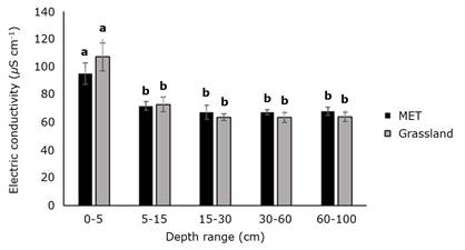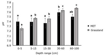 Table 2. Two-way ANOVA for land uses (MET and Grassland), depths (0-5, 5-15, 15-30, 30-60, and 60-100 cm), and their interaction on the chemical properties of a Vertisol.