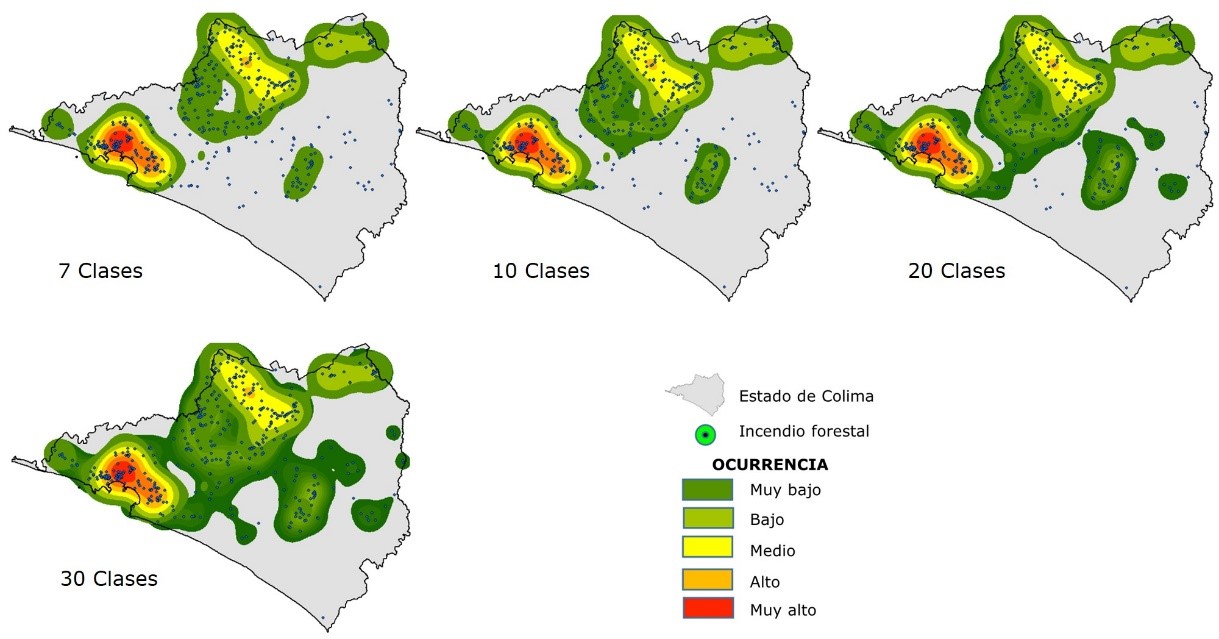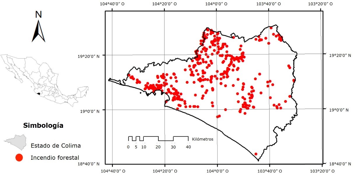 Es importante señalar que se debe asegurar que en la modelación se consideren las variaciones antrópicas de las densidades de ocurrencia de los incendios, como es el caso del análisis de densidad Kernel. De acuerdo con lo anterior, el objetivo de este trabajo fue determinar las variaciones espacio-temporales de la ocurrencia de incendios, mediante la estimación de la densidad Kernel, y analizar las condiciones que los favorecen para, finalmente, definir áreas prioritarias de atención para la prevención de incendios forestales. Para ello, se utilizó información del historial de incendios forestales (2016-2023) en el estado de Colima, México (Conafor, 2024).