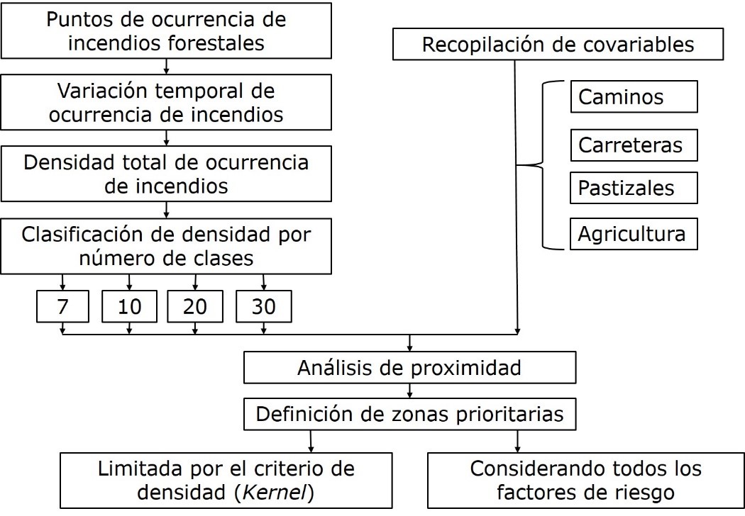 El riesgo de incendio, probabilidad de que ocurra en un lugar y tiempo determinados, depende de las condiciones que propician su ignición, tales como la cercanía a centros de población, uso del fuego en actividades agropecuarias, cercanía a vías de comunicación y la ocurrencia histórica de incendios (Comisión Nacional Forestal [Conafor], 2024). No obstante, la naturaleza antrópica de las causas implica que estas cambien en su distribución espacial, lo cual define una dinámica para la localización de las áreas donde se presentan los incendios forestales (Ruíz-Corzo et al., 2022). Como resultado de esto, la tendencia social de la ocurrencia de incendios propicia su repetición frecuente en las mismas zonas; y con ello, se definen densidades específicas de la ocurrencia de incendios (Ocampo-Zuleta & Beltrán-Vargas, 2018). Esta variación puede modelarse espacialmente mediante herramientas estadísticas específicas, como máquinas de aprendizaje, regresiones bayesianas, econometría espacial o regresión logística.