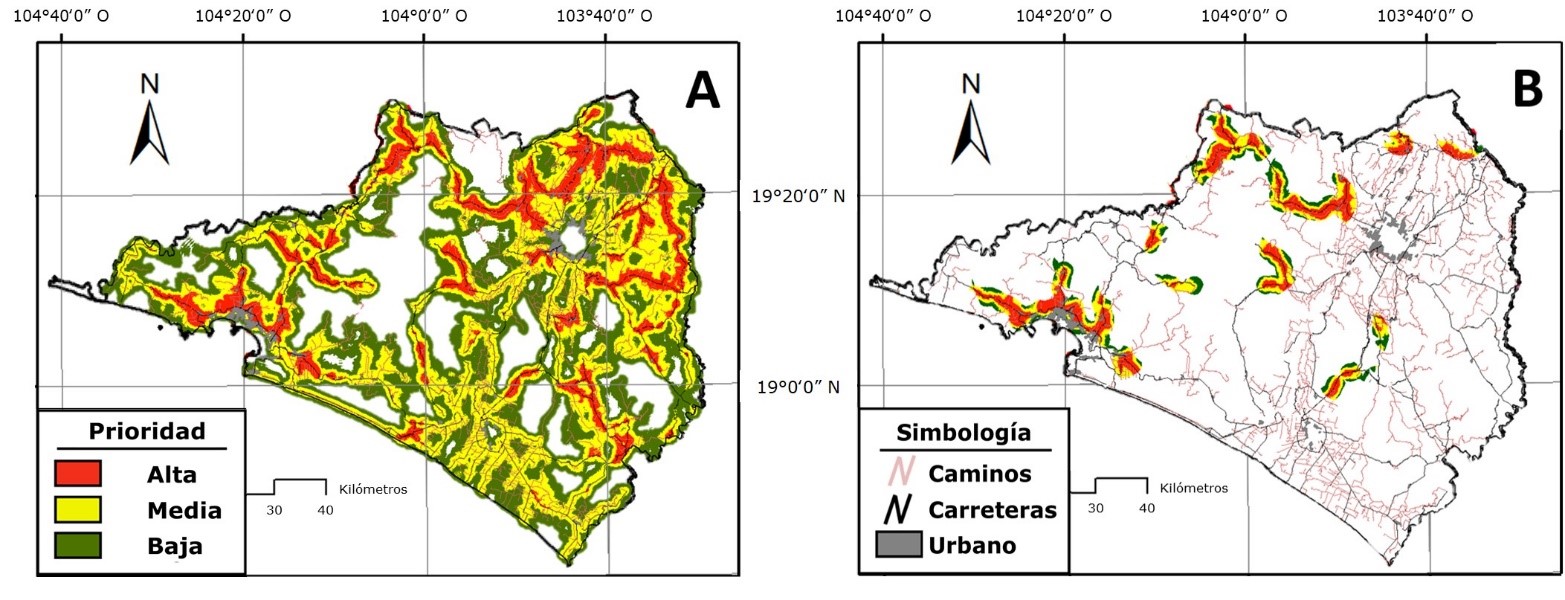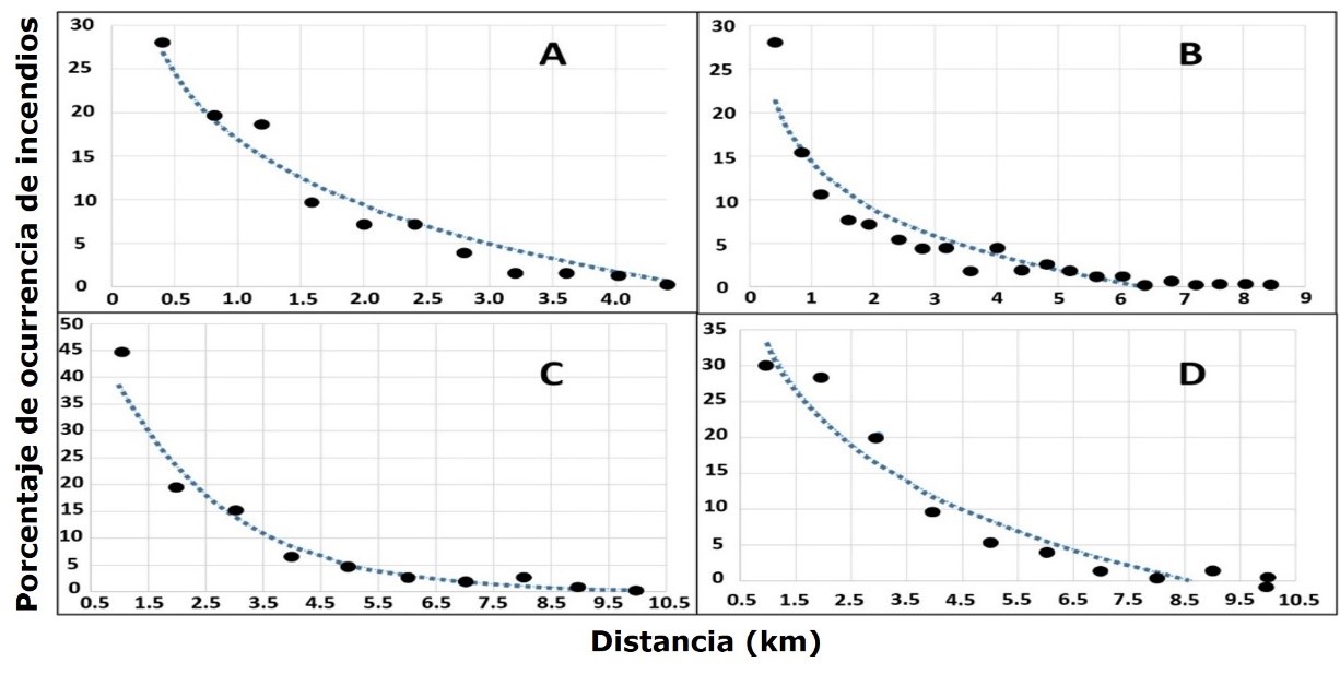 Específicamente, alrededor de la mitad de los incendios se ubicaron en un intervalo de distancia de 0 a 800 y 1 200 m, para caminos y carreteras respectivamente. Si se considera que una de las causas principales de los incendios forestales en Colima es la quema de pastizales para el rebrote de pasto tierno, la mayor ocurrencia se registró de 0 a 1 000 m de las zonas de pastizales, distancia que es menor al intervalo de proximidad a las áreas agrícolas (0-2 000 m). Si se consideran tres cuartas partes del porcentaje de frecuencia de incendios forestales, es claro que la proximidad a caminos representa el factor de mayor riesgo, lo cual coincide con Cruz et al. (2017). Por lo que la implementación de actividades preventivas, se debe enfocar a las áreas con máxima densidad de incendio (Rodríguez et al., 2008), en las que se ubique la mayor presencia de caminos (Figura 5A).