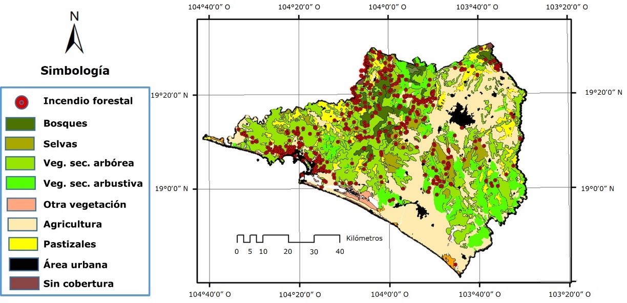 Figura 1. Distribución espacial de los incendios forestales en el estado de Colima, durante el periodo 2016-2023.