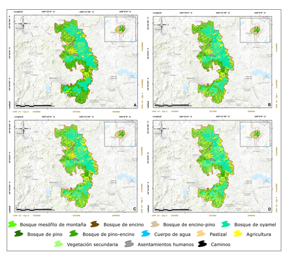 El presente análisis multitemporal indica un proceso de degradación de la cobertura forestal original a nivel ecosistema y el uso de suelo en la RBMM, principalmente, en ecosistemas como el bosque de encino, bosque de pino y bosque mesófilo de montaña que han perdido 87, 69 y 42 %, respecto a la superficie que ocupaban en 1994; lo anterior se debe a la tala ilegal, expansión de la agricultura, incendios forestales, aumento de plagas y enfermedades como consecuencia de las variaciones climáticas, así como al cambio de uso del suelo para el establecimiento de aguacatales (López-García et al., 2022).