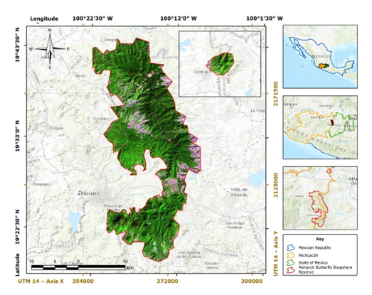 The Monarch Butterfly Biosphere Reserve is located in Central Mexico and includes part of the Michoacán and Mexico states, specifically in Eastern Michoacán and the Western State of Mexico (Figure 1). It covers 56 259 ha distributed over a core area of 13 551 ha and a buffer zone of 42 708 ha (Comisión Nacional de Áreas Naturales Protegidas [Conanp], 2001). This reserve is known for being the hibernation site of Danaus plexippus, a migratory species that travels from Canada and the United States to the temperate forests of Mexico.