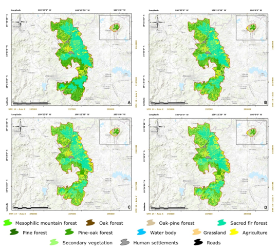 Given this scenario, it is recommended to generate transition maps of major land use change in order to prioritize conservation and ecological restoration strategies in critical areas, such as oak, pine, mesophilic montane, and fir forests, which serve as a basis for the implementation of sustainable management and environmental protection measures that are key to mitigating the impacts of deforestation and ensuring the resilience of these ecosystems, and, therefore, of the Monarch butterfly.
