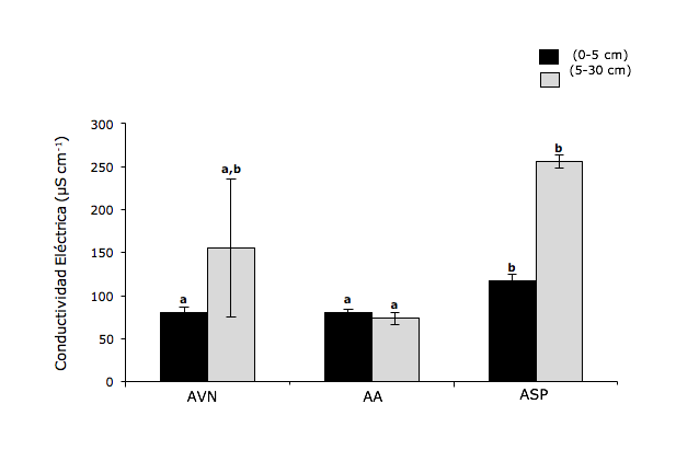 En las parcelas de AVN y ASP se registró un aumento significativo de conductividad eléctrica con valores de 155.8 y 255.6 μS cm-1, respectivamente a los 5-30 cm, mientras que en el AA fueron de 73.4 μS cm-1para la misma profundidad. Los más altos de las dos áreas antes mencionadas pueden deberse a la presencia de heces de ganado bovino en el ASP y al alto contenido de materia orgánica en el AVN; por el contrario, en el área con los números más bajos, AA, no se utiliza ningún tipo de fertilizante o producto químico.