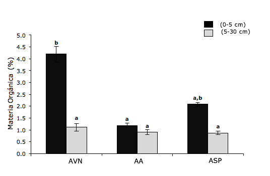 Existen diferencias significativas entre usos del suelo en el contenido de materia orgánica y carbono orgánico para la profundidad de 0-5 cm, pero los valores son más altos en AVN (4.20 y 2.43 %), en comparación con los de AA (1.19 y 0.69 %). La máxima acumulación de materia orgánica fue en la profundidad de 0-5 cm en los usos del suelo de AVN y ASP, con tendencia a disminuir a medida que aumenta la profundidad. Esta diferencia en la distribución de la materia orgánica en estos dos sistemas se debe, principalmente, a que en el AVN el aporte de materiales naturales ocurre sobre la superficie del suelo en forma de hojarasca, ramas y otras estructuras; mientras que en el ASP el aporte de la materia orgánica se produce desde las raíces de las gramíneas dentro de la parte superior del suelo como humus rizógeno (Baldock y Nelson, 2000).