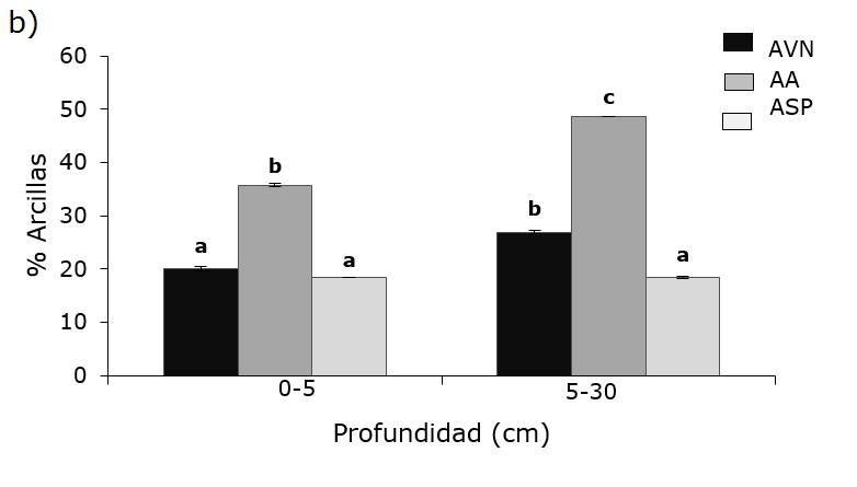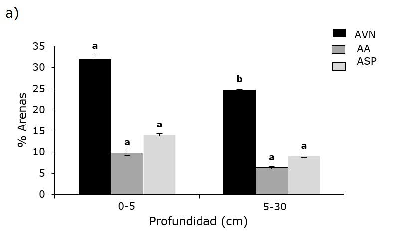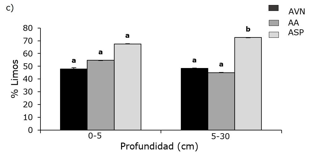 Figura 5. Valores medios (%) de a) arena, b) arcilla y c) limo en las profundidades 0-5 y 5-30 cm para AVN, AA y ASP.
