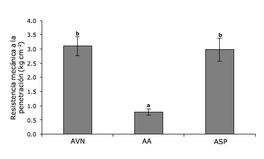 Los resultados más destacados de resistencia mecánica a la penetración fueron para AVN (2.98 kg cm-2) y ASP (3.10 kg cm-2), y lo contrario para AA (0.78 kg cm-2).
