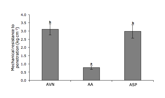 The most outstanding results of mechanical resistance to penetration were for AVN (2.98 kg cm-2) and ASP (3.10 kg cm-2), and the opposite for AA (0.78 kg cm-2).