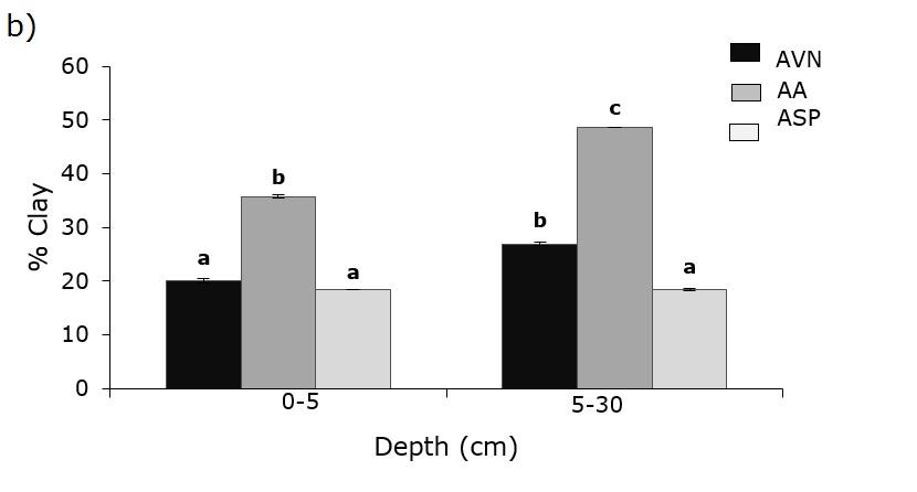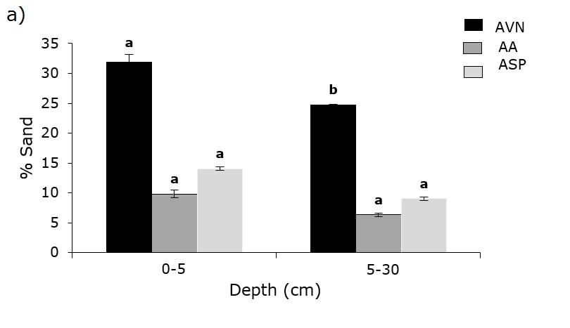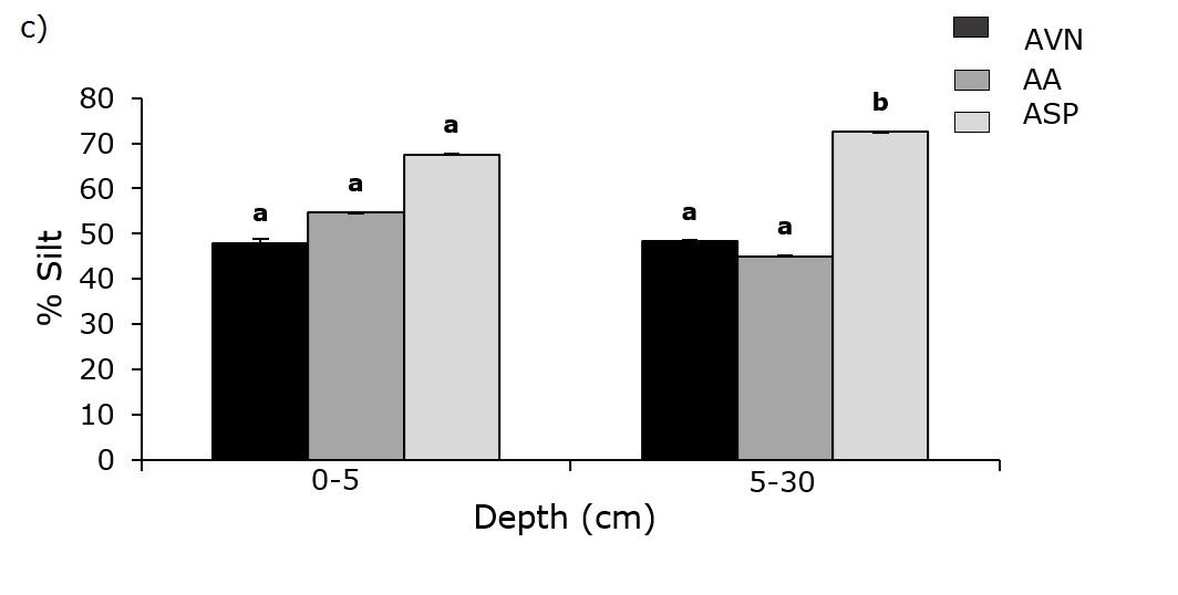 Figure 5. Mean values (%) of a) sand, b) clay and c) silt at 0-5 and 5-30 cm depths for AVN, AA and ASP.