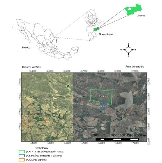 The study area is located in three adjoining properties belonging to the ejido Gatos Güeros in Linares municipality, Nuevo León, between 25°07'55.2" N and 99°18'59.1" W, with an altitude of 225 m (Figure 1). The selected properties are located in the Subprovince of Llanuras y Lomeríos (Plains and Hills) whose name comes from the presence of plains interrupted by scattered hills, low slopes and soft conglomerates. The type of climate is BS1 (h') semi-dry very warm-warm, with average annual rainfall of 600-700 mm, average annual temperature of 22.4 °C and that of the coldest month is greater than 18 °C; summer rains and the percentage of winter rain is from 5 % to 10.2 % of the annual total (García, 1981).
