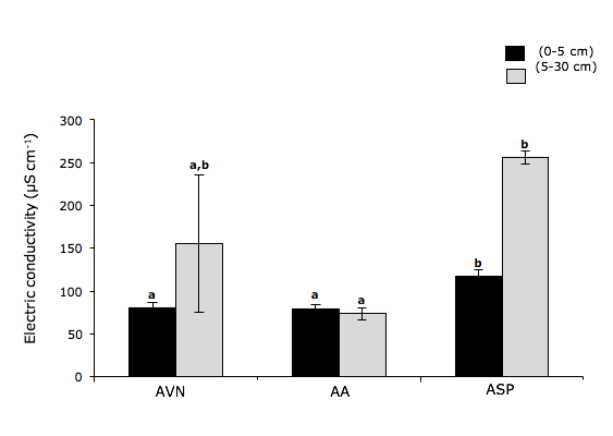 Figure 3. Mean values of the soil electric conductivity at 0-5 and 5-30 cm depths for the three types of land use.