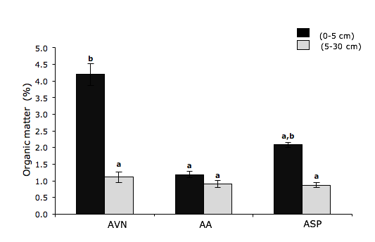 There are significant differences between the types of land use in the content of organic matter and organic carbon for the 0-5 cm depth, but values are higher in AVN (4.20 and 2.43 %), compared to those of AA (1.19 and 0.69 %). The maximum accumulation of organic matter was in the 0-5 cm depth in AVN and ASP, with a tendency to decrease as depth increases. This difference in the distribution of organic matter in these two systems is mainly due to the fact that in AVN the contribution of natural materials occurs on the surface of the soil in the form of leaf litter, branches and other structures; while in the ASP the contribution of organic matter is produced from the roots of grasses within the upper part of the soil as rhizogenic humus (Baldock and Nelson, 2000).