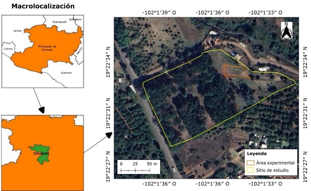 La investigación se llevó a cabo en el Área de Bosques de la Estación Experimental de la Facultad de Agrobiología Presidente Juárez de la Universidad Michoacana de San Nicolás de Hidalgo (UMSNH), localizada en la ciudad de Uruapan, Michoacán. La plantación de Pinus cembroides se estableció en un área de 1 126.1 m2, ubicada entre las coordenadas geográficas 19°22’28.7’’ y 19°22’34.8’’ N y -102°1’30.8’’ y -102°1’40.3’’ O (Figura 1).