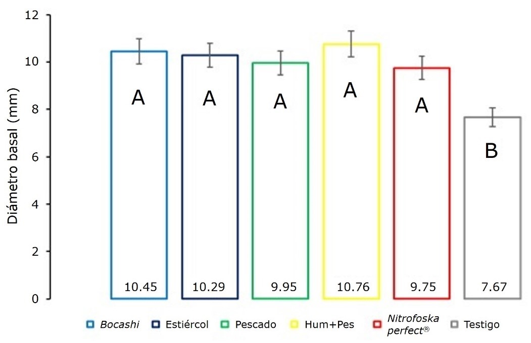 De acuerdo con los resultados de la prueba de Tukey (α=0.05), todos los tratamientos con enmienda incrementaron el diámetro basal en comparación con el testigo, lo cual permitió que se formara un mismo grupo estadístico (Figura 4) Cabe destacar que la enmienda a base de ácidos húmicos más extracto de pescado presentó un incremento de 40.3 % en diámetro basal, en comparación con el testigo; mientras que, con la enmienda mineral a base de Nitrofoska perfect® se obtuvo 27.1 % de incremento en diámetro basal con respecto a lo obtenido por el testigo, que fue el tratamiento con menor promedio de diámetro basal (Figura 4).