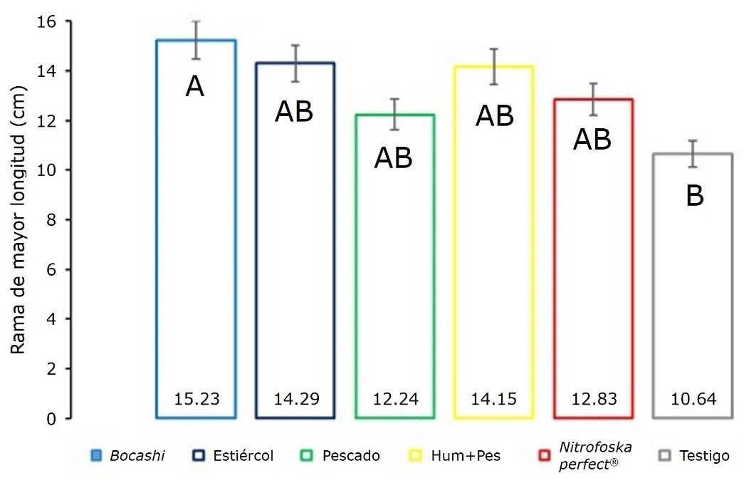 A partir de los resultados de la prueba de Tukey (α=0.05), la enmienda a base de bocashi incrementó en 43 % la rama de mayor longitud en comparación con el testigo, lo que a su vez permitió formar un mismo grupo estadístico con el resto de tratamientos que contenían algún tipo de enmienda. Los tratamientos a base de extracto de pescado y Nitrofoska perfect® registraron los promedios más bajos (Figura 5).