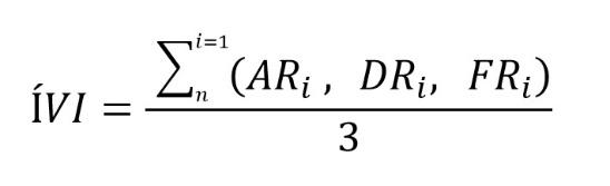 Para la diversidad arbórea, se utilizó el índice de valor de importancia (IVI), que sirvió para jerarquizar la importancia de cada especie en la vegetación ribereña, con base en las variables de dominancia (AR), densidad (DR) y frecuencia relativa (FR) (Smith y Smith, 2007):